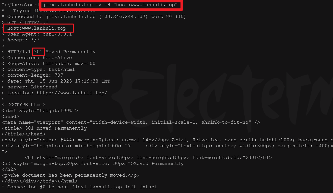 还是访问这个域名,但是修改 host 为 www.lanhuli.top,返回 301 跳转。服务器根据 host 值进行访问站点。