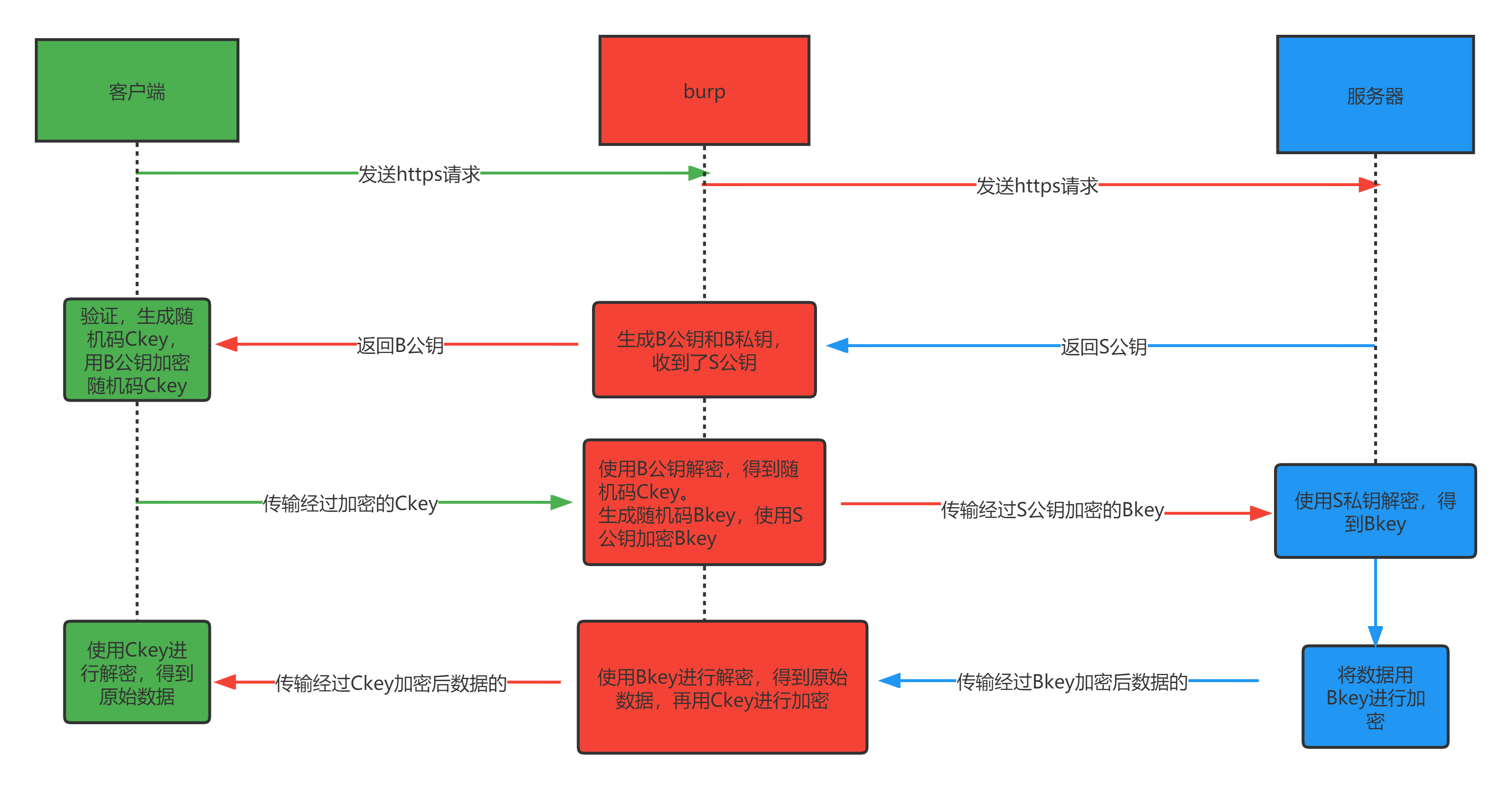 5)同样服务器返回的内容也是,BurpSuite 会先解密,然后得到明文, BurpSuite 会伪装成服务器,再用 BurpSuite 与客户端协商好的密钥进行加密然后传输内容。