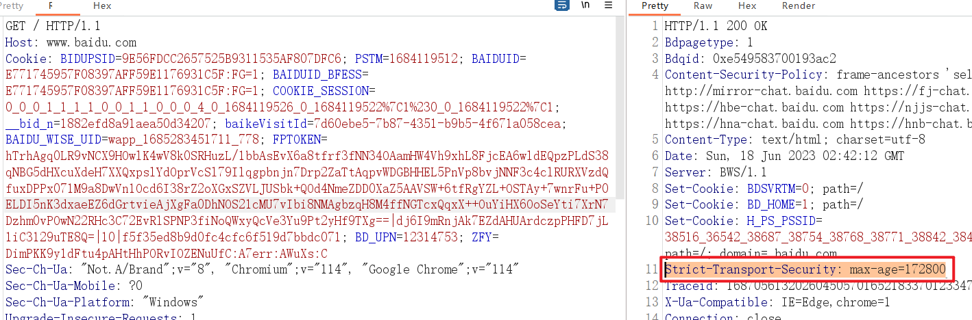 Strict-Transport-Security: max-age=172800 :STS 头部声明。参数含义是在 172800 秒内(48 小时),浏览器只要再向百度或其子域名发送 HTTP 请求时,由浏览器自动转成 HTTPS 来发起连接。这样可以减少服务器重定向的处理和被中间人截获请求的风险。