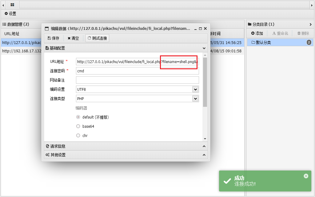 使用蚁剑进行连接,利用文件包含漏洞加载图片木马,可以成功连接。
