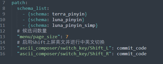 打开 default.custom.yaml 文件,在patch下增加一个空白处,注意前面空两格,添加 "menu/page_size": 7