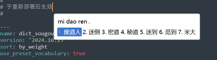 .dict.yaml前面的值保持一致,测试的时候不一致也没问题,但是尽量一致; - version:管理词典的版本,规则同输入法方案定义文件中的版本号;