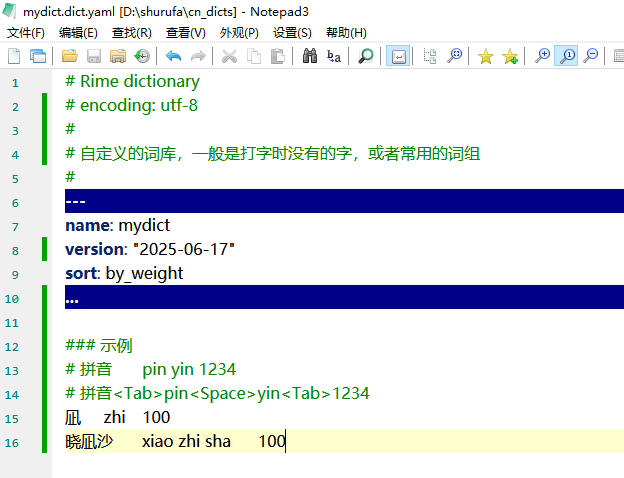 编辑 mydict.dict.yaml 文件,添加自定义的词。注意格式