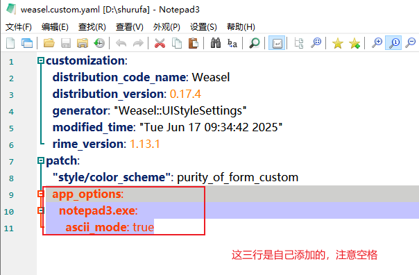 打开 weasel.custom.yaml 文件,在 patch 中添加如下内容