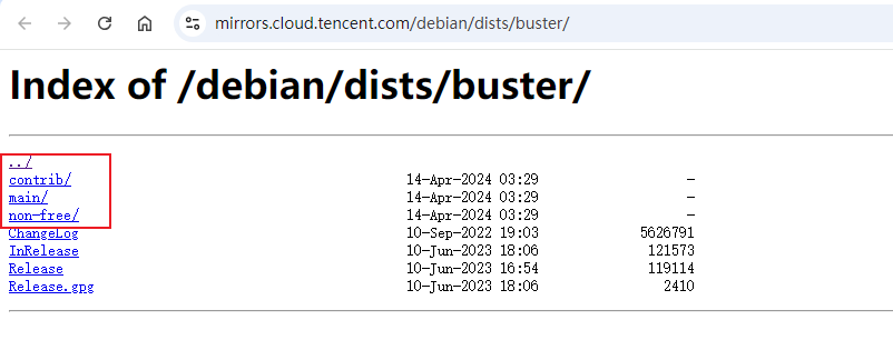 通过浏览器找到地址,打开对应为的地址 /dists/buster/ 可以看到 main、contrib、non-free 这三个文件夹