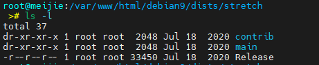 其次,我们在自己搭建的镜像源目录里也可以找到对应的目录,这里只有 main、contrib,没有 non-free
