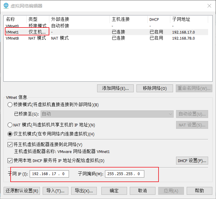 所有主机网络设置均为仅主机模式,子网 IP 为 192.168.17.0,所有主机 IP 均为静态 IP。所有主机防火墙尽可能关闭,否则可能导致无法通信。
