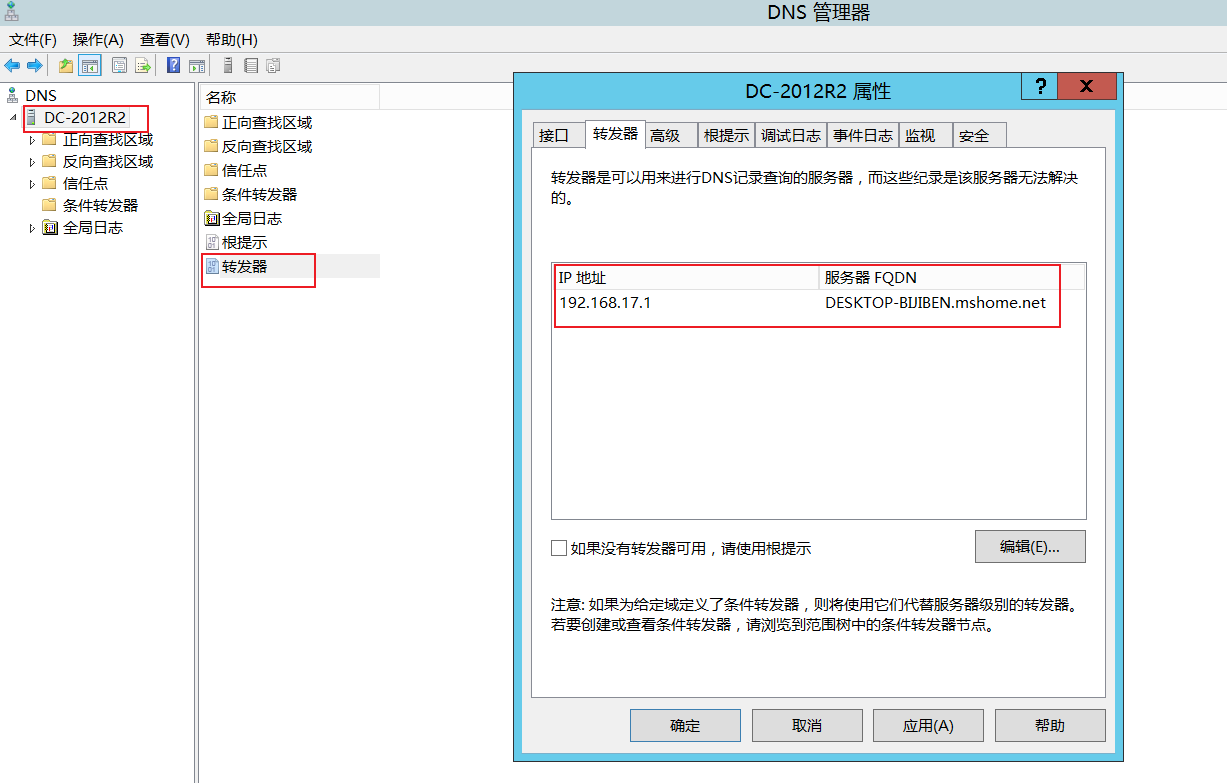 注意:用户 pc 的 DNS 服务器还是域控的 ip。因为我们在访问外网时(如 baidu.com),他会先进行 DNS 解析,将这个 DNS 请求发送给域控制器,域控制器在转发给 VMnet 1(192.168.17.1)。
