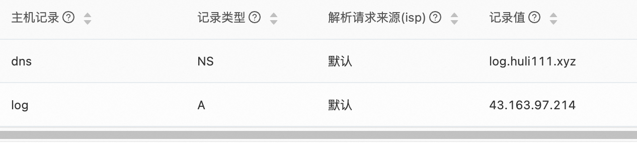 添加一条 A 记录:将 log.huli111.xyz 指向服务器的 IP。然后再添加一条 NS 记录,将 dns.log.huli111.xyz 指向 log.huli111.xyz
