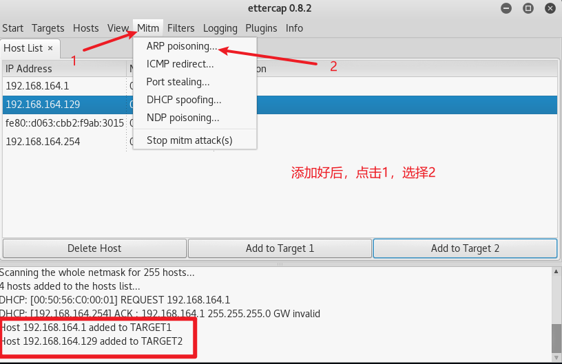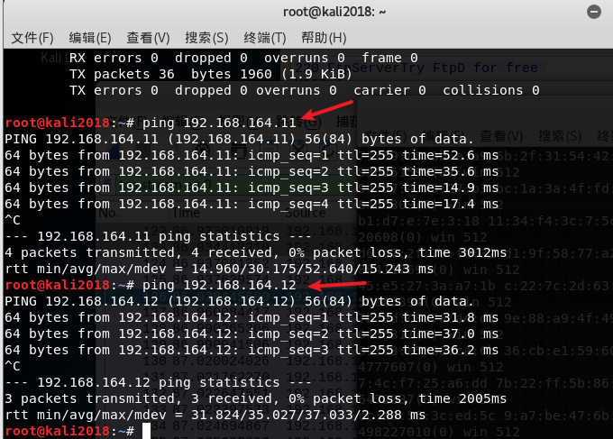 4、搭建好后,kali对其192.168.164.11和12进行ping,可以平通即可
