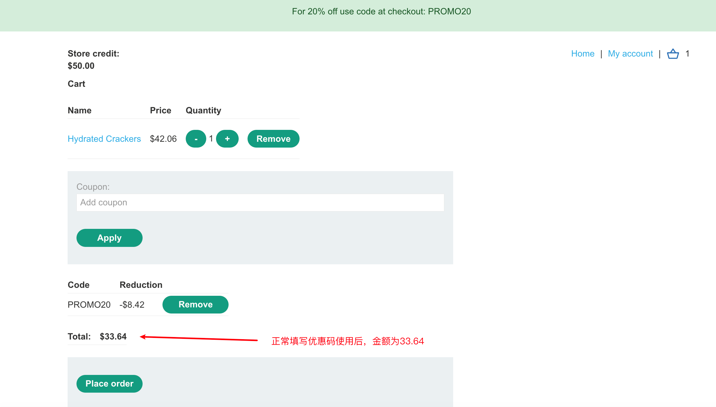 然后点击一个商品,添加到购物车,填写优惠码可以有折扣。