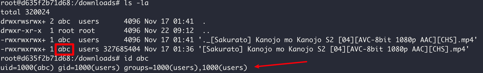 在 docker compose 的 yml 文件中指定 puid 和 pgid 为 1000,当这个容器创建运行的时候,进入容器里面。可以看到文件的所有者是用户 abc,他的 puid 值为 1000。
